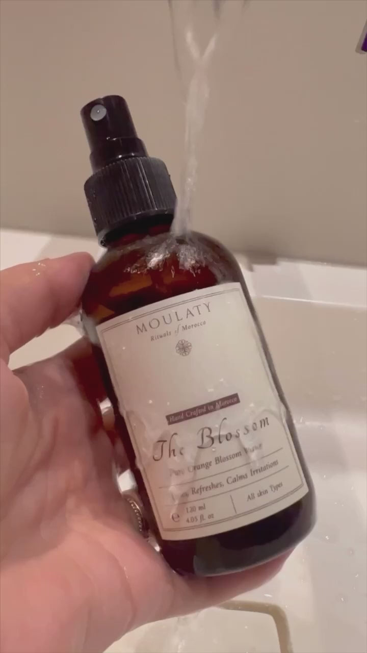 Our Moroccan orange blossom water is freshly steam distilled from the flowers of the bitter orange tree. This luxurious toner has been used for centuries in traditional Moroccan skincare rituals. It is known for its soothing and hydrating properties, making it perfect for all skin types, including sensitive skin.